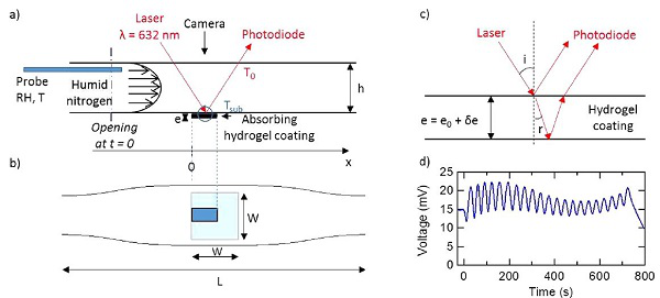 例如图6所示,Tran等[8]人利用水凝胶的溶胀特性检测了水凝胶薄膜在吸收水蒸气后的体积(厚度)变化。当薄膜吸收水分时,水凝胶产生溶胀,其厚度发生改变,通过干涉仪接收干涉信号的改变,可以计算观测薄膜厚度的变化。研究人员还在水凝胶表面接枝了多种聚合物,通过改变水凝胶的亲水性以及交联密度,可以观察不同特性的水凝胶薄膜在富含水蒸气的环境中对水分的吸收及其相应的溶胀动力学变化。