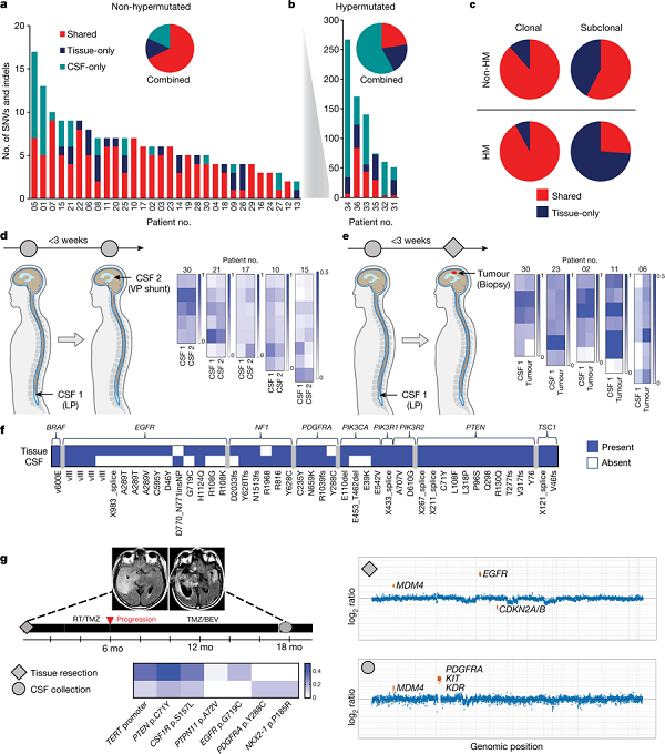 美国纪念斯隆凯特琳癌症中心的Michael F. Berger教授 和Ingo K. Mellinghoff教授(共同通讯作者)等团队合力刚在Nature上在线发表了题目为“Tracking tumour evolution in glioma through liquid biopsies of cerebrospinal fluid”的关于胶质瘤肿瘤演变的追踪。在文中,研究人员评估了85例接受腰椎穿刺的神经胶质瘤患者脑脊液中神经胶质瘤基因组的表现,因为他们表现出神经系统症状或体征。研究显示85例患者中有42例(49.4%)在脑脊液(CSF)中检测到肿瘤来源的DNA,并且与疾病负荷和不良结果相关。CSF中胶质瘤的基因组景观包括广泛的遗传改变,并且与肿瘤活组织检测的基因组非常相似。在肿瘤发生早期发生的改变,例如染色体臂1p和19q (1p/19)的共同缺失和代谢基因异柠檬酸脱氢酶1(IDH1)或IDH2的突变,在所有匹配的ctDNA阳性CSF肿瘤中共享成对,而生长因子受体信号通路显示出相当大的进化。通过微创技术监测神经胶质瘤基因组进化的能力有助于推动临床开发和使用基因型定向疗法治疗胶质瘤。
