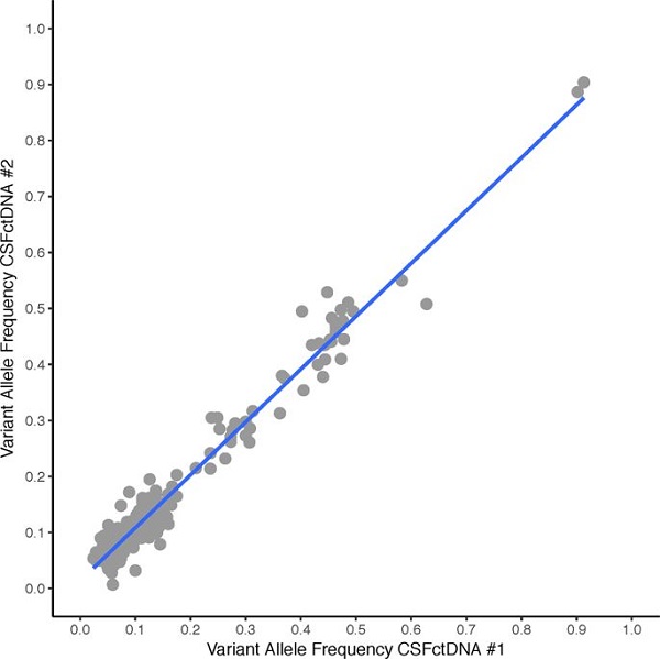 图八、来自具有DNA超突变的患者34的两个独立收集的CSF样品中的所有SNV的变体等位基因频率
