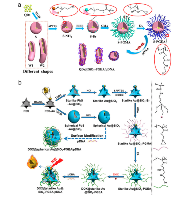 图10.QD@SiO2−PGEA(a)和Au@SiO2−PGEA(b)纳米复合物的制备及后改性工艺示意图