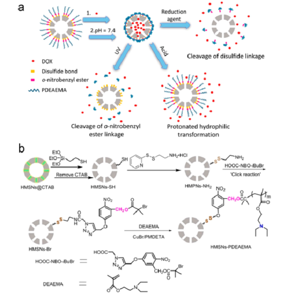 图11.用PHPMA和PDEAEMA对MSN进行功能化的表面结合双功能异质引发剂和合成路线的原理图