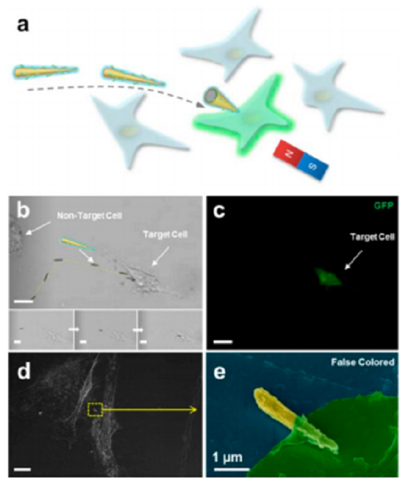 d,e.SEM图像,纳米锥与其靶细胞的对接