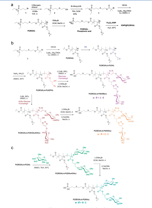 a. 含膦酸酯引发剂和P(OEGA)功能化氧化铁、二嵌段隐形糖共聚物的合成原理图