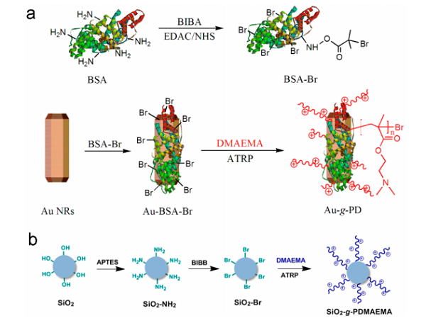 图7. PDMAEMA/Au(a)和PDMAEMA/SiO2纳米复合物(b)的合成路线示意图
