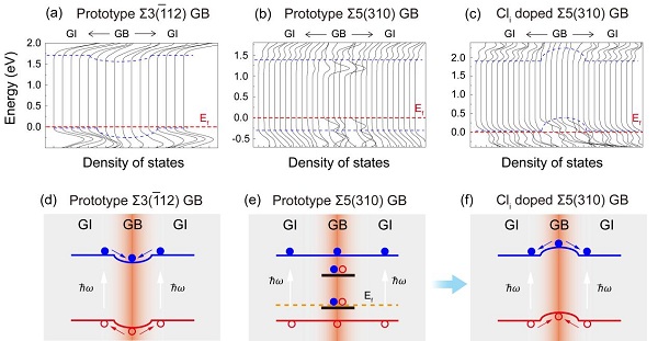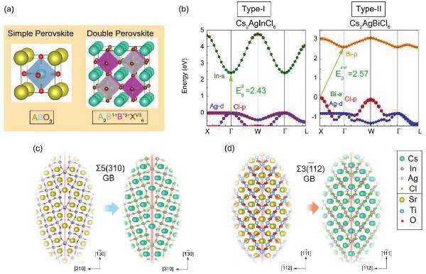 由于CH3NH3PbI3具有铅毒性和不稳定性,因此探索无毒、稳定的卤化物钙钛矿非常有意义。最近,新一代无铅卤化物双钙钛矿(HDPs)(A2B1+B’3+X6)是一种有望克服有机无机卤化物钙钛矿材料固有缺点的稳定环保的光电材料。迄今为止,研究人员已成功合成了几种HDP,如Cs2AgInCl6、Cs2AgBiX6(X = Cl, Br)等。然而,实验中所观测到的HDP的器件性能低于其理想值,因此探索其性能差距的物理起源以及如何提高其效率成为一个重要的科学问题。与其他传统半导体类似,HDP的器件性能可能受其有害缺陷的限制,包括晶体内部(GI)和晶界(GB)缺陷。因此,亟待了解HDP中低能晶界的电子特性以及其如何影响HDP的光电和器件性能。