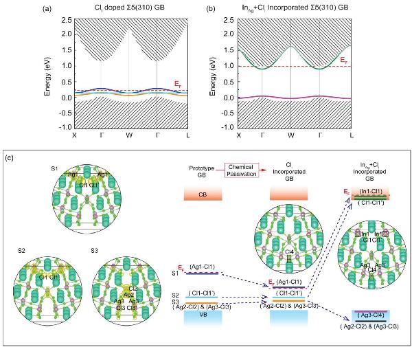 c) Cs2AgInCl6中Σ5(310)GB处Cli和InAg + Cli掺入对能带结构调控的示意图。