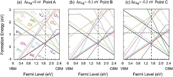 在ΔμAg= 0 eV点A(图a)、ΔμAg= -0.1 eV点B(图b)和ΔμAg= -0.2 eV点C(图c)生长条件下,Cs2AgInCl6中20种本征点缺陷的形成能。用于缺陷计算的三个代表性化学势点A-C在图4中用黄色圆圈表示。