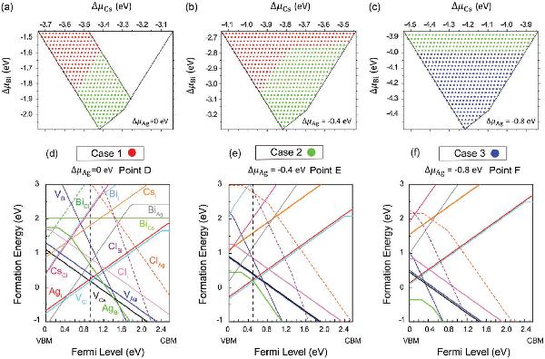 在ΔμAg= 0 eV点D(图d),ΔμAg= -0.4 eV点E(图e)和ΔμAg= -0.8 eV点F(图f)生长条件下Cs2AgBiCl6中20种本征点缺陷的形成能。用于缺陷计算的三个代表性化学势点D-F在图7中用白色圆圈表示。