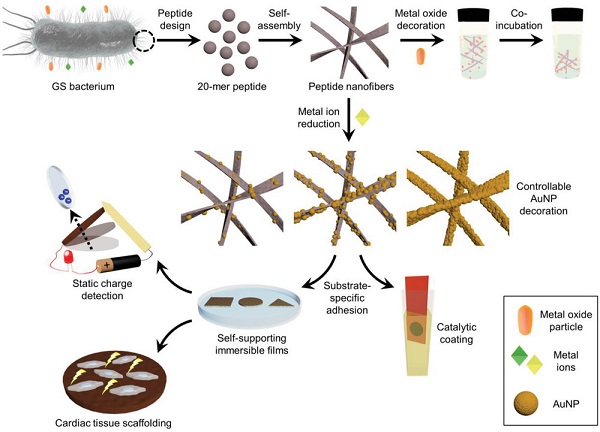 受到GS T4P与金属氧化物和金属离子的天然相互作用的启发,探索了这些物质与T4P类自组装肽纳米纤维之间的类似相互作用。研究了金属氧化物与纳米纤维的结合,以及后者还原离子Au的能力。通过纳米纤维的离子Au还原过程以可控的方式形成肽-AuNPs纳米复合材料。由于其基质选择性粘附和导电性,肽-AuNPs纳米复合材料被用于化学催化、静电荷检测和心脏组织支架应用。