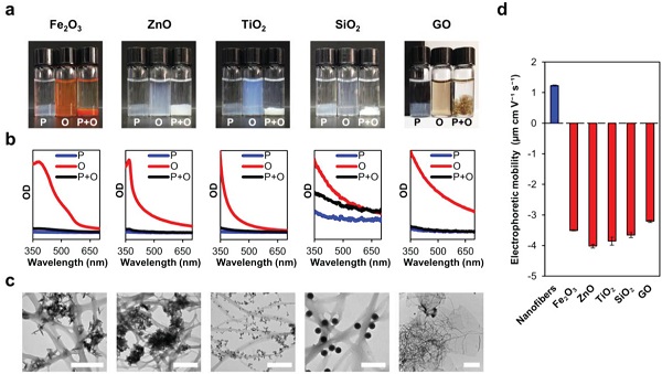 (a)纳米纤维分散体、氧化物颗粒的不同分散体和肽纳米纤维-氧化物混合物的照片;