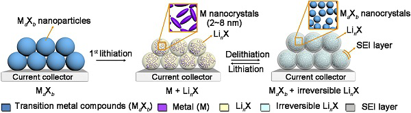 在该等式中,Lin X的形成在热力学上是可行的。然而,通过本体M粉末难以分解电化学惰性的Lin X。因此,这种转化机制可逆性的关键在于形成高电活性M纳米颗粒以分解由固体电解质中间相 (SEI)层包围的Lin X基质。此外,电压滞后似乎高度依赖于转换型正极材料(CTAM)中阴离子物质的性质,以氟化物 > 氧化物 > 硫化物 > 氮化物 > 磷化物的顺序降低。