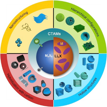 利用纳米工程技术来增强转换型正极材料(CTAM),以提高锂离子电池的能量密度。主要包括使用低维纳米结构、分层多孔纳米结构、空心结构和与各种碳质材料的杂交。