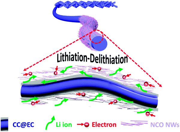 虽然已报道的柔性材料具有优异的特性,但是它们主要的问题是机械稳定性程度。尽管碳纤维布(CC)的优异机械稳定性可以解决该问题,但CC仍然受到低表面积、更大重量和低存储容量的限制。正如Tong课题组所报道的在柔性CC核-壳阳极(CC@EC)上生长NiCo2O4纳米线(NCO NWs)来设计单片核-双壳(CDS@NCO CDS)。CC@EC@ NCO CDS电极显示出优于原始CC涂层NCO (CC@NCO)的锂储存性能。
