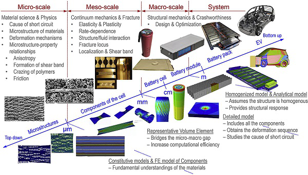 电池能量密度的快速增长,伴随着锂离子电池成本的大幅降低,却带来了安全问题。虽然电动汽车电池组中储存的能量越多,行驶的里程越长,但由于电池会发生爆炸,导致事故将更加严重。因此,锂离子电池的安全性问题也越发受到重视。电池安全性的研究涉及多个尺度。下面从三部分讨论特定规模和特定规模的进展。