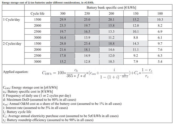 供电系统包括并网系统和离网系统。在电网中,电力供应必须在严格的质量标准下与用户需求相平衡,即必须确保不间断电源的标称值(如频率和电压)的裕度很小。下表概述了锂离子电池的储能成本,考虑到不同的具体成本和循环寿命,每天使用一个循环和两个循环。表中的结果分为三个颜色区域。深灰色表示超过15 c€/kWh储能成本在并网使用中没有竞争力。浅灰色对应的成本范围为10-15 c€/kWh,在电价变动剧烈的情况下可能会带来竞争力,尤其是如果锂离子电池还能保证运营储备等辅助服务。白色表示低于10 c€/kWh的成本具有竞争力的成本范围。当然,除了这些一般模式之外,还需要在实际市场条件下进行更密切的评价,以确定这种储存费用的竞争能力以及这种投资可预期的盈利能力。显然,锂离子电池仍远未达到下表中所强调的并网使用的成本竞争范围。