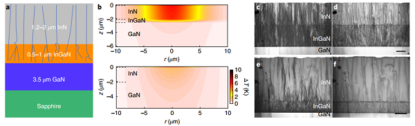a.高定向贯穿性位错InN示意图;b.InGaN 隔热层可以让热流更多的在InN面内传输,增加TDTR测量的灵敏度;c-f.贯穿型位错InN膜TEM截面图。