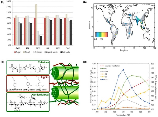 (d)温度与体积流量的相关性:无果胶苹果渣作为硬碳前体的主要气体组分和气体释放累积曲线。