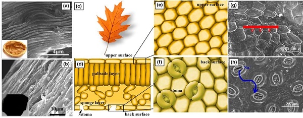(c-f)叶子(c),横截面(d),上表面(e)和后表面(f)的示意图;