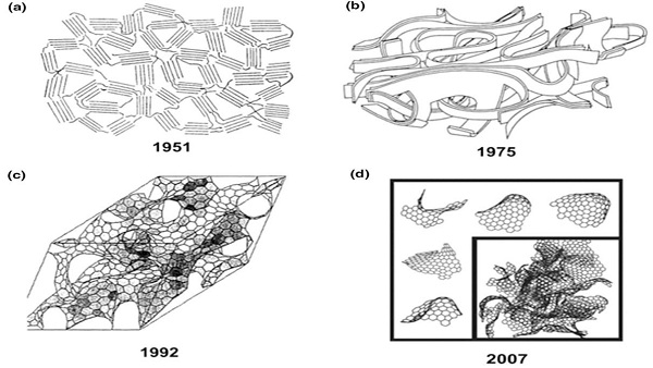 (d)在硬碳中高度缺陷的2D类石墨烯层示意图。