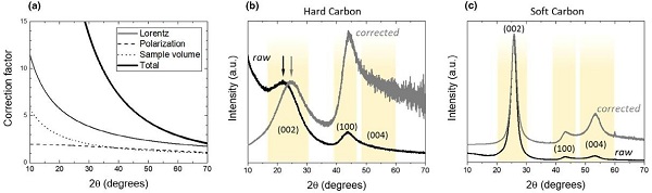 (b,c) 粉末X射线衍射图案,硬碳(b)和软碳(c)。