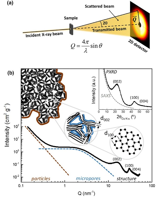 1、吸附/解吸测量 其提供了孔隙率信息,不同的气体分子表现出不同的吸附行为,有些孔隙可能无法进入氮气,但对氦气“开放”,导致不同的值,离子物质可以通过不同的途径穿透硬碳,当将孔隙度与钠储存机制联系起来时,总是需要吸附测量。因此,小角X射线散射(SAXS)是一个更好的补充方法,以确定可逆的精确孔隙度,来研究储钠性能。