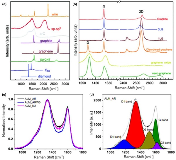 3、X射线衍射 一些研究报告了石墨烯层的层间距离,这是根据布拉格定律计算的。然而,实验室规模的衍射仪的几何形状角度依赖检测到的强度。对于结晶性差的材料,如硬碳,这可能会导致反射失真和转移他们中心位置。因此,在考虑计算层间距离的峰值位置时,应考虑修正因素,以避免对结果进行任何误导。