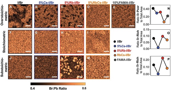 目前已录得最高转换效率的铅卤钙钛矿太阳能电池(PSCs)是由混合的甲胺等有机阳离子和混合的溴、碘等卤素阴离子制备形成的。研究人员发现,调控有机/无机离子的化学计量数是实现高效光电流的关键。然而,前驱体的化学计量数的调控以及碱金属的引入对改善材料性能、稳定性等方面的机理探索依然还处在起步阶段。