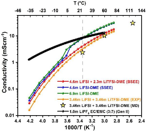 不同单盐和双盐醚电解质的电导率。为了比较,黄色星代表用等摩尔、高浓度双盐醚电解质的分子动力学预测的电导率值。