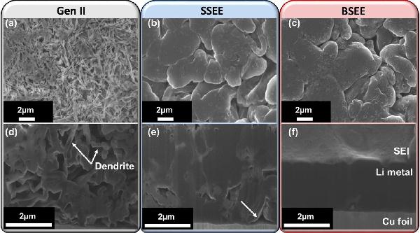 b,e) 在SSEE中循环时,锂初始形态的顶视SEM图像及其相应的Cryo-FIB横截面切割图像;
