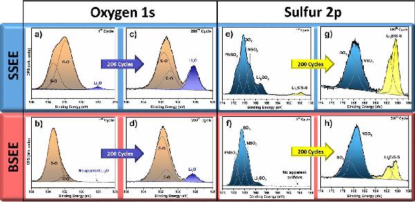 e-h) 不同电解质中锂金属首次沉积和第200次沉积的S 2p XPS谱图。