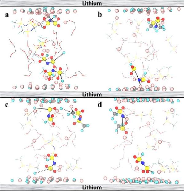 a-d) 从夹在LiF覆盖的锂金属之间的BSEE电解质的BOMD模拟中提取的最终快照,显示12 ps的七个轨迹中的四个表明阴离子通过脱氟或S-N裂解而分解的趋势。图例:Li(粉红色)、F(青色)、O(红色)、S(黄色)、N(深蓝色)和C(灰色),断裂的键用虚线突出显示。