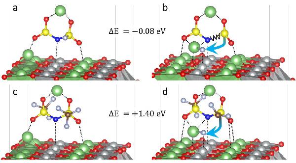 Li2FSI和Li2TFSI在LiNiO2(104)表面的反应机理,图例:Li(绿色)、S(黄色)、O(红色)、N(蓝色)、Ni(深灰色)、F(浅灰色)和C(棕色),b,d图中箭头表示脱氟反应。