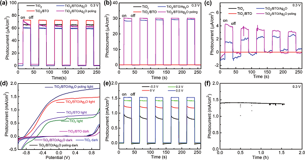 首先,在导电玻璃上原位生长TiO2单晶纳米棒,保证了载流子的快速传输;在n型TiO2的表面负载p型Ag2O纳米颗粒,由于Ag2O的禁带宽度窄,其光的吸收利用能够到达近红外区,并且与n-TiO2形成的p-n结能使载流子定向传输。更为重要的是,通过在p-n结处插入具有压电效应的BaTiO3(BTO)纳米层,能够进一步增强TiO2与Ag2O中电子和空穴的分离能力。通过外加电场增强载流子的定向传输,使其具有高效的光电PEC性能。研究成果以题“Piezoelectric-Effect-Enhanced Full-Spectrum Photoelectrocatalysis in p–n Heterojunction”发表在国际著名期刊Adv. Funct. Mater.上。中科院北京纳米能源所博士生刘志荣与济南大学硕士生王龙伟是文章的并列第一作者。