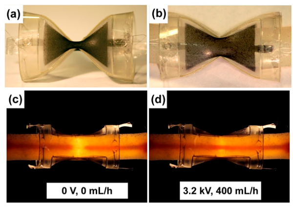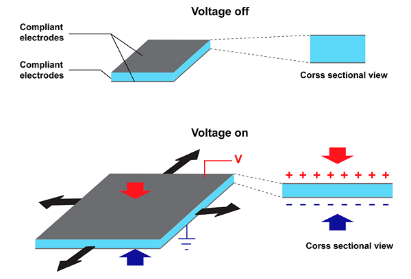 DEA由夹在两个柔性电极之间的弹性体组成,当施加电压时,发生电荷分离并在膜上引起静电压力,这会使薄膜变形,增加其面积并减小其厚度。