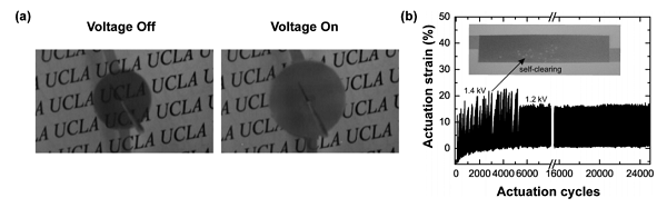 (b)由于CNT的自清除效应,硅树脂CNT致动器的循环致动测试表明寿命延长。