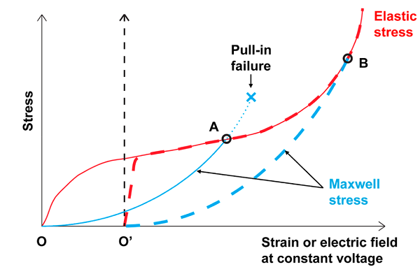 图3 DEs的特征应力–应变曲线作为非预拉伸薄膜(具有原点O的实曲线)和预拉伸薄膜(O’处的虚线曲线)的机械应变或电场(在恒定电压下)的函数图