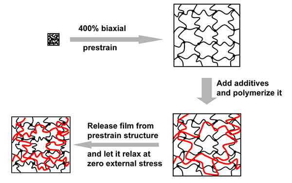 弹性体是预拉伸的(黑色网络)并喷涂多功能单体添加剂,然后在主机网络中聚合形成第二网络(红网)。