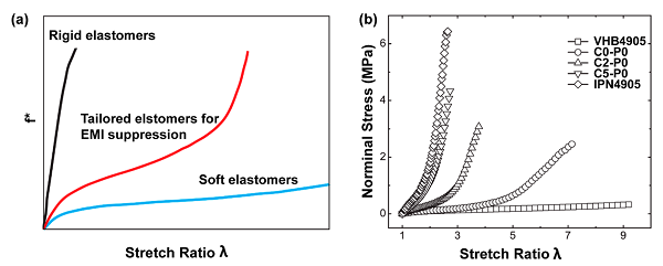 (a)作为刚性,柔软和定制弹性体的拉伸比(λ)的函数的特征模量或应力(f*);