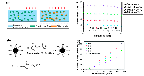 (a)由于填料形成的导电路径而经历电击穿的DE复合材料的图示(左); 具有受阻电渗透的封装导电填料(右);
