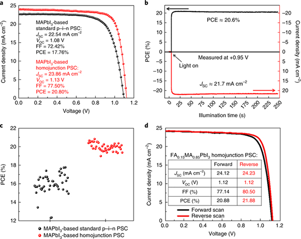 文献链接:Planar p–n homojunction perovskite solar cells with efficiency exceeding 21.3% (Nature Energy. 2019, DOI: 10.1038/s41560-018-0324-8)