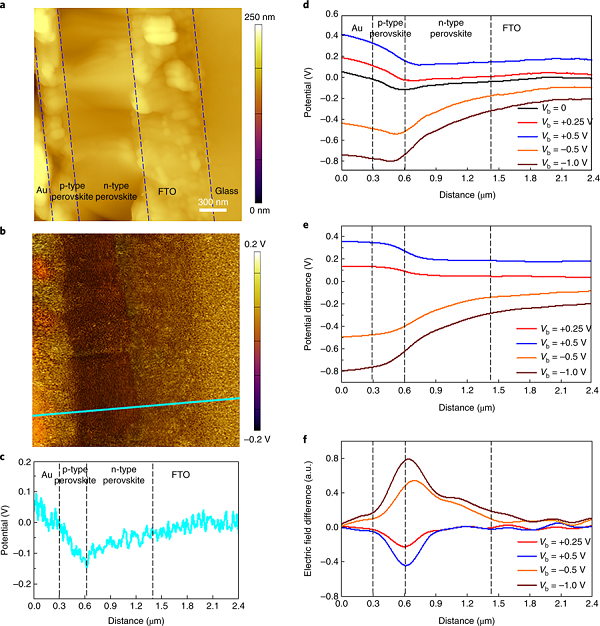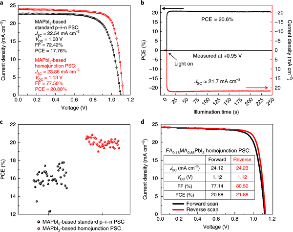 该团队首次实现了钙钛矿p-n同质结结构,并通过截面的KPFM等测试技术证明了钙钛矿同质结中内建电场的形成;将MAPbI3同质结应用于平面型钙钛矿电池中,获得了20.5%的认证效率;进一步将FA0.15MA0.85PbI3同质结应用于平面型钙钛矿电池中,获得了21.38%的光电转换效率。这项工作通过对钙钛矿材料载流子浓度与分布的精确调控,设计了钙钛矿p-n同质结结构,为提高钙钛矿太阳电池性能提供了具有前景的方法。此外,钙钛矿p-n同质结结构拓宽了钙钛矿材料在太阳电池以外领域的应用。