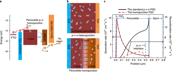 有机无机杂化钙钛矿太阳电池以其出色的光电转换效率、灵活简单的制备工艺以及优异的材料特性掀起了研究的热潮。近十年,钙钛矿电池的认证效率由最初的3.8%迅猛发展到23.7%。目前平面型钙钛矿电池大多基于p-i-n异质结的结构,然而钙钛矿材料具有可控的自掺杂特性,这使钙钛矿同质结结构的设计成为可能,有望突破现有p-i-n结构的限制。在钙钛矿同质结的结构中,p型和n型的钙钛矿薄膜间可有效地形成内建电场,将其引入平面型电池中,可以有效增强载流子的定向传输,进一步减少复合损失,从而提升光电性能。