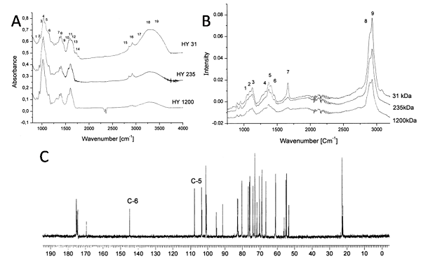 图 7 透明质酸的(A) IR图、(B)Raman图和(C)13C NMR谱图[7]。