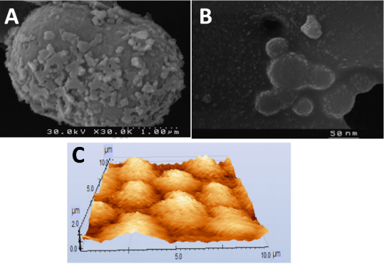 图 3 CuO纳米粒子的(A) SEM、(B) TEM、(C)AFM图[3]。