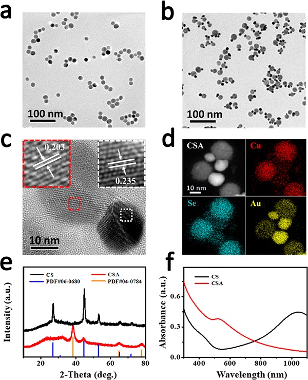 在这个工作中,作者通过室温下硒化铜纳米颗粒与HAuCl4溶液之间的自发氧化还原反应,成功制备了硒化铜-金异质结纳米颗粒晶体。由于协同效应,所得的异质结构在光热转化效率和X射线衰减方面比单独的硒化铜纳米颗粒、金纳米颗粒及两者混合物具有更好的性能。这些特性确保了硒化铜-金异质结纳米晶体在多模态成像、放疗与热疗协同治疗原位乳腺癌时的良好性能。