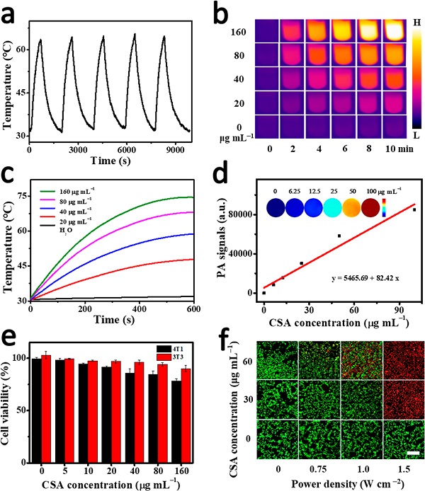 (f).不同浓度CSA纳米探针在不同激光强度照射下对4T1细胞的杀伤作用