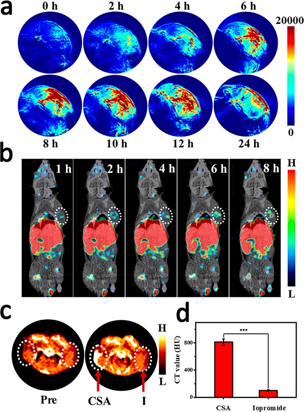 (c,d).瘤内分别注射CSA纳米颗粒和碘普罗胺溶液后,肿瘤的CT图像和信号强度对比