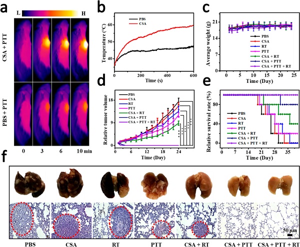 (a,b). 4T1原位荷瘤小鼠在注射CSA纳米颗粒溶液和PBS溶液后光热治疗时的红外热成像图像和肿瘤部位升温曲线