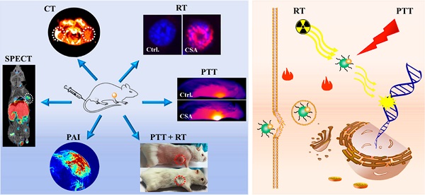 为了最大限度地提高肿瘤组织对射线的辐射敏感性,同时尽量减少辐射对正常组织的损伤,诸如金、铋、钨、铂等高原子序数的纳米材料被广泛用作放射增敏剂。它们可以通过EPR效应富集到肿瘤部位,成为集多模态成像(CT成像、光声成像、磁共振成像等)以及多模式治疗(光热治疗、放射治疗等)于一体的新一代纳米诊疗探针。研究表明,这些能将放疗与其它疗法相结合的纳米颗粒可以显著提高肿瘤的治疗效果。其中一种最有效的组合是放疗与光热治疗相结合,这种联合治疗可以有效消融肿瘤细胞,防止肿瘤转移和复发。