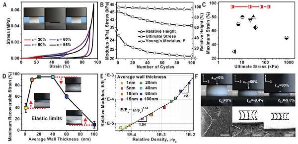 近期,哈尔滨工业大学的李惠研究员和加州大学洛杉矶分校的黄昱、段镶锋(共同通讯作者)等人利用三维石墨烯气凝胶模板设计合成了同时具有强大的机械和热学稳定性的氮化硼(hBNAGs)以及碳化硅(βSiCAGs)陶瓷气凝胶材料。这类陶瓷材料由纳米层状双窗格壁组成,整体呈现出超低密度的双曲线构造形态。而这一特殊结构赋予材料负泊松比(-0.25)以及负线性热膨胀系数(-1.8×10-6/℃),致使材料维持热稳定性的同时依然能表现出优异的可变形性和断裂韧性。在剧烈的热休克(大约275℃/s)以及长期高温暴露过程中,这类材料表现出优异的热稳定性以及几乎为零的强度损失。同时此种气凝胶还表现出超低的热导率(在真空中约为2.4 mW/m·K,在空气中约为20 mW/m·K),因此研究人员认为基于上述新型陶瓷气凝胶可以设计理想的超级隔热系统并在航天器等领域有所应用。2019年02月15日,相关成果以题为“Double-negative-index ceramic aerogels for thermal superinsulation”的文章在线发表在Science上。